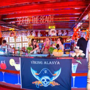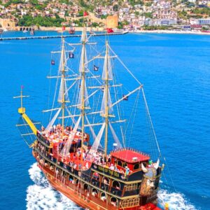 Čeká vás celodenní plavba na nealkoholcké pirátské lodi. Loď lemuje pobřeží Alanye ve Středozemním moři. Během plavby si můžete vychutnat výhled na historickou pevnost, nejznámější tureckou pláž Kleopatra či známé jeskyně Alanye. Během plavby budou zastávky, které budou ke koupání.